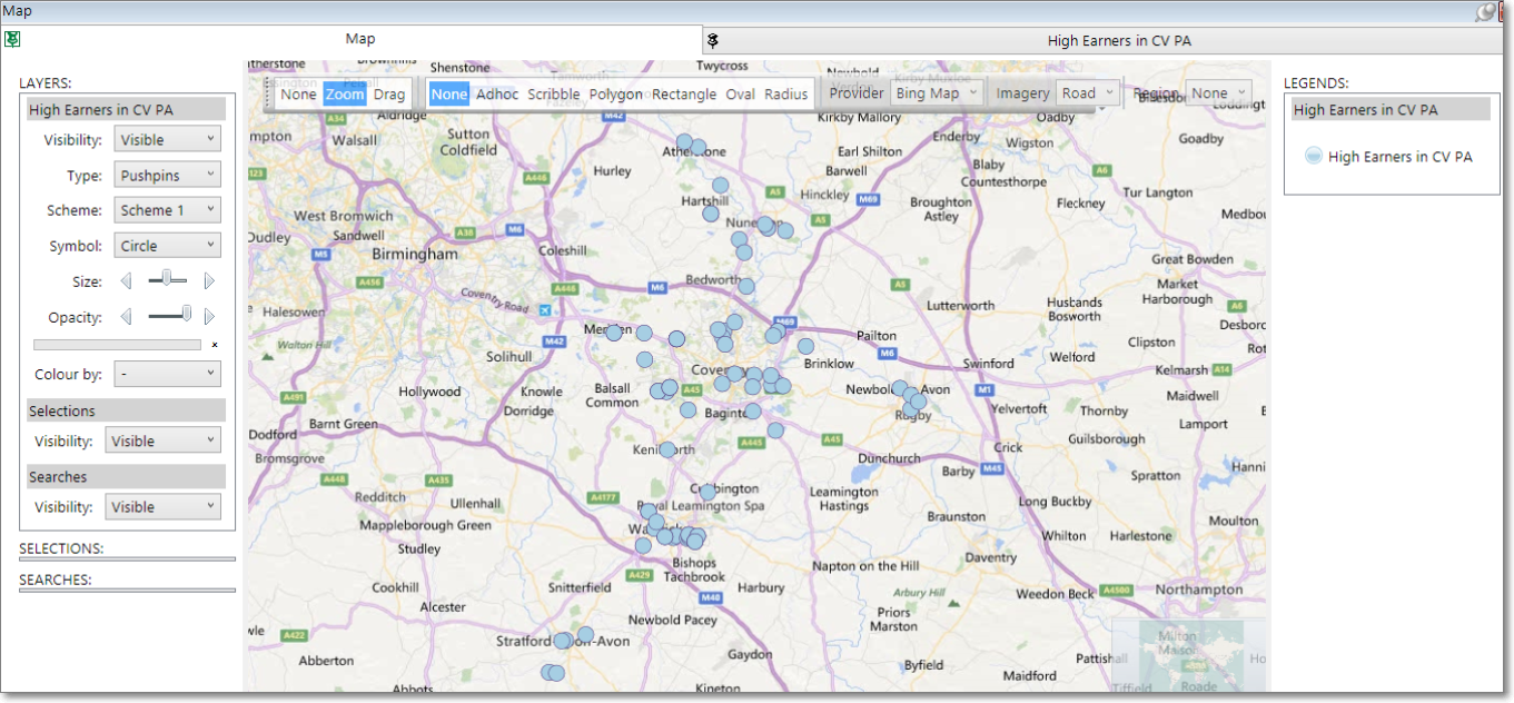 A plot map allows you to display records using a more precise geographical boundary and provides the opportunity to look at the location of smaller groups of customers or prospects around the country. For the greatest precision and to keep Bing transactions to a minimum, it is recommended that you use longitude and latitude co-ordinates, although it is also possible to use variables such as UK Postcode or US Zip code, and an example of this is shown below.