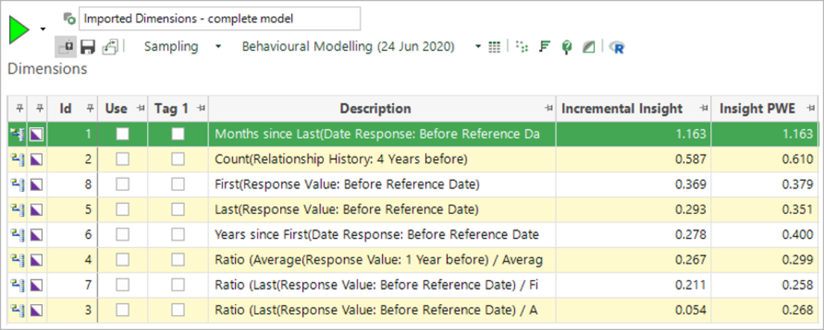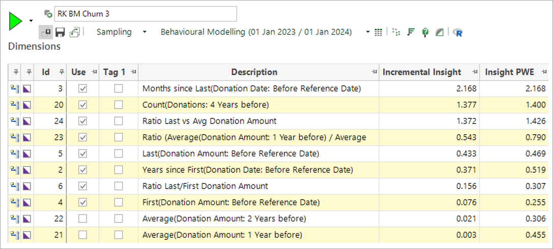 To use these dimensions, for example in a churn model as demonstrated here, you need to set up an analysis selection of people who have churned. When the model is built, these dimensions characterise the differences between people who have churned and those who have remained loyal supporters.