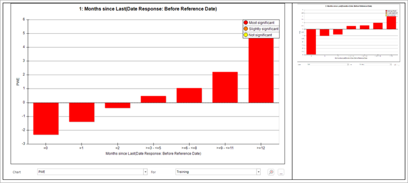 Use the Build button on the Dimensions tab to assess these behavioural features. This process will compare the analysis and base selections using these dimensions. The PWE measure highlights the key characteristics which differ between these two groups. A positive PWE indicates that a particular group of people are more likely to churn, i.e. be in the analysis selection.