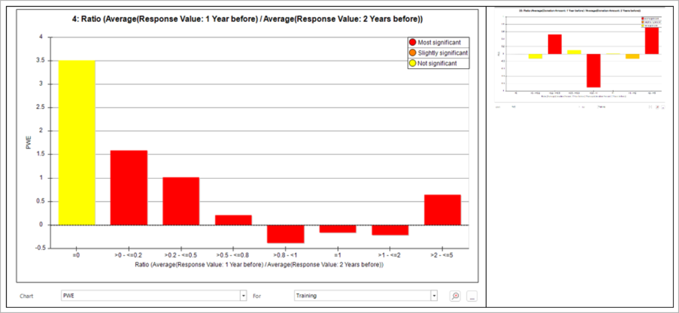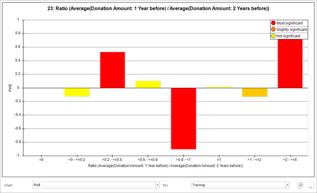 Some of the more involved features provide greater and potentially unexpected insight. The following chart shows that people who made a modest reduction in their average donation are less likely to churn. This is based on the last year’s average donation being 80 to 100% that of the previous year. People who have made a much larger reduction (20-50%) are likely to churn. Interestingly, people who have made a large increase in their donation value are also likely to churn.