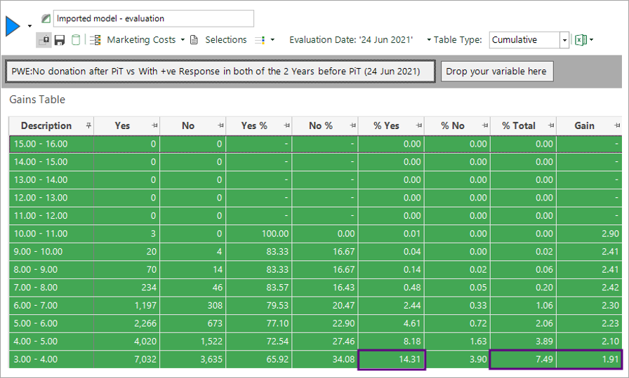 When this model was evaluated, it gave a 2-fold gain, based on targeting the top 7.5% from the model.