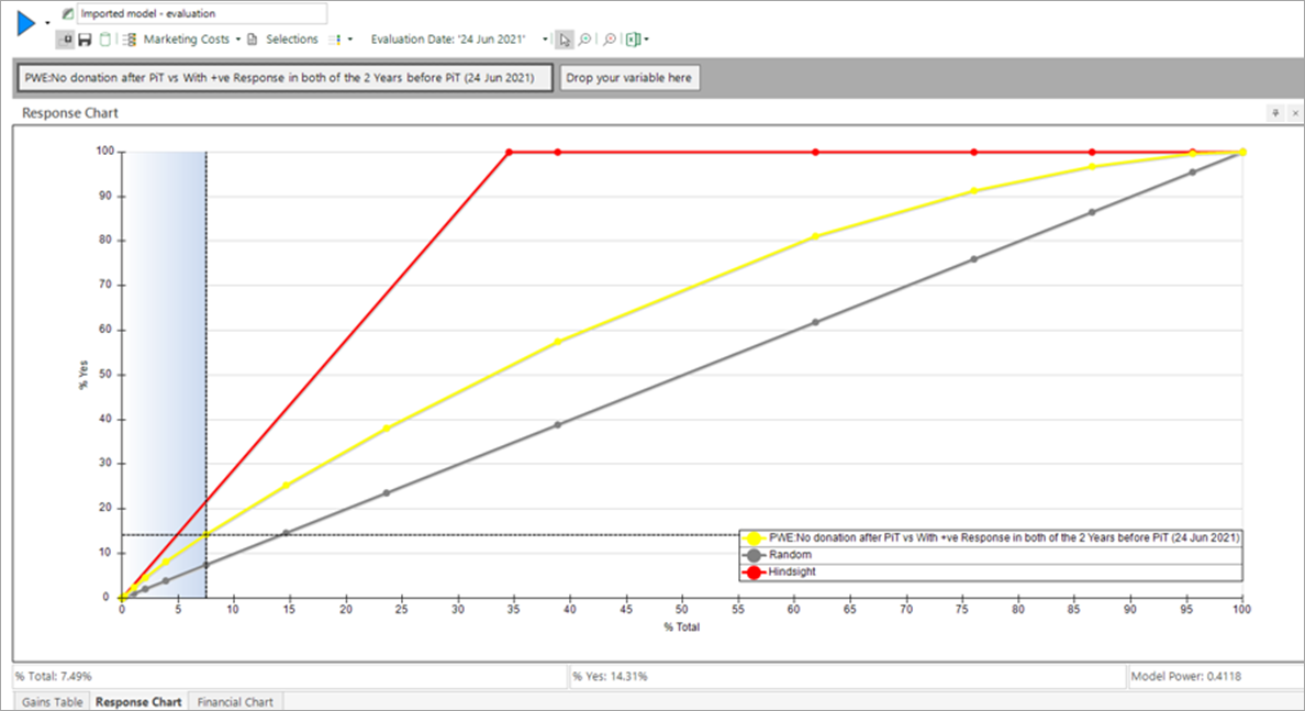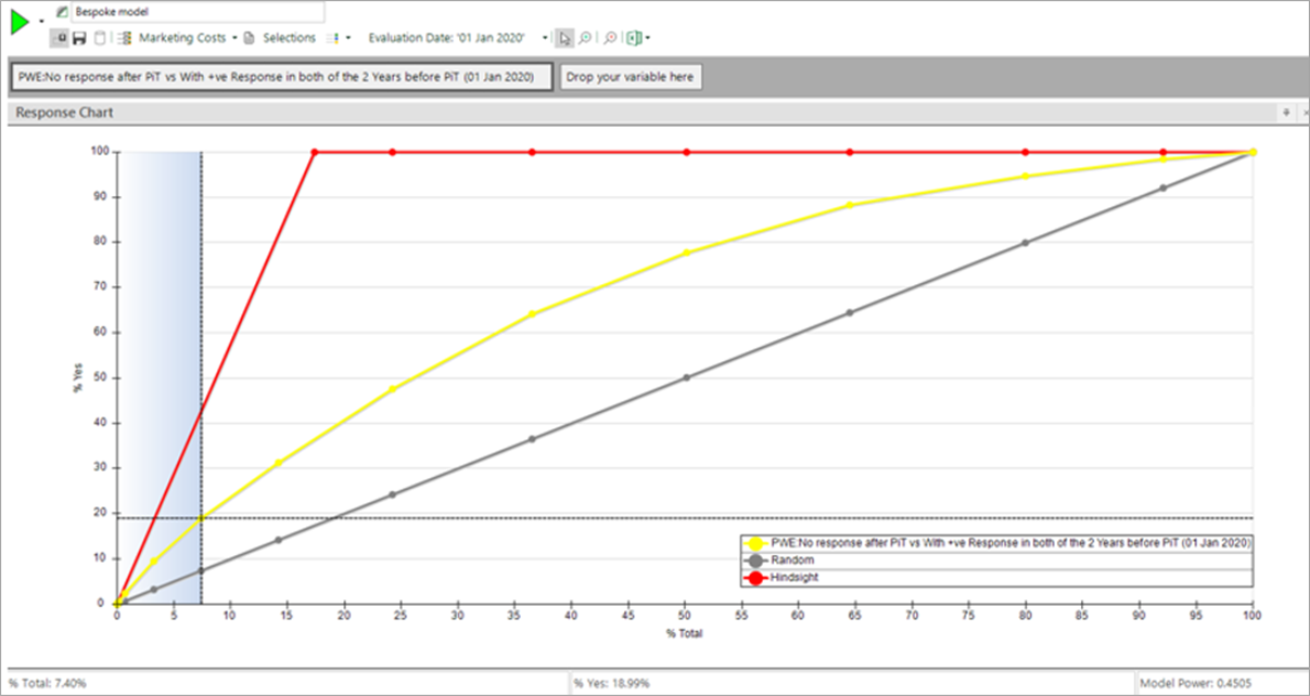 Graphically this is shown below. The highlighted point on the model would target about 7.5% of supporters (x-axis) and would reach 14.3% of people who were later known to have churned (yellow curve on y-axis). This is double (1.9x) compared to what you would expect (i.e. 7.5%) from random targeting (the grey line).