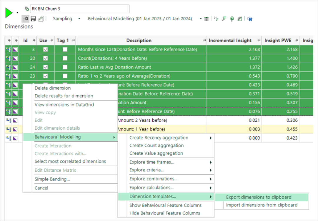 Selected dimensions can be exported as a template to the clipboard using the right click menu options, as shown below.