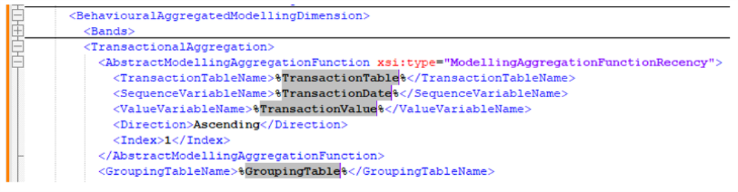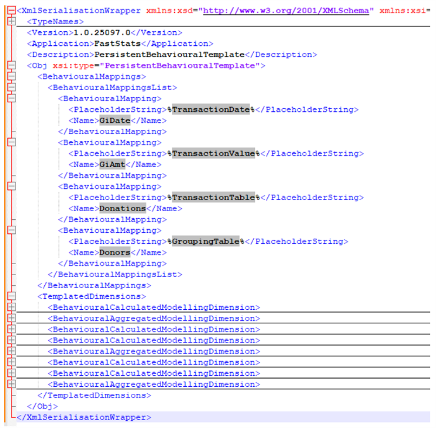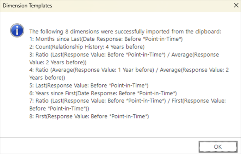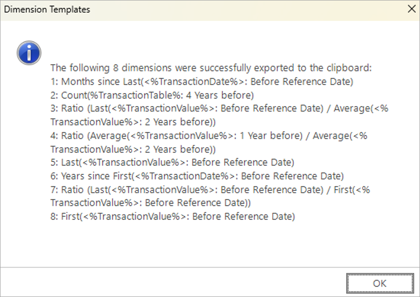 The confirmation message shows that the dimensions have been exported. Notice that the behavioural features are now expressed in terms of placeholders, such as <%TransactionDate%>.