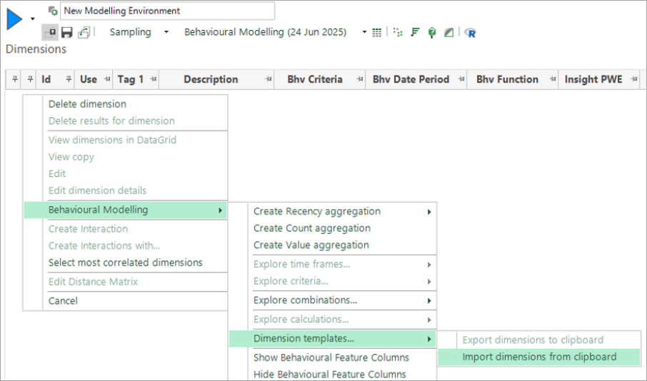 In the new system, open a new Modelling Environment and use the right-click menu options on the Dimensions tab to import the template you have just copied: