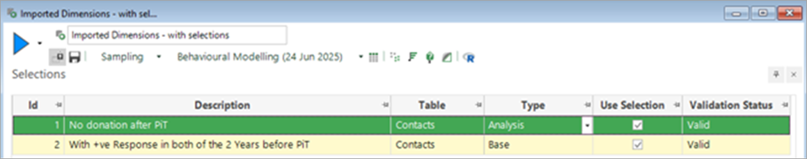 These selections need to be added on the Selections tab, as shown below. The full definition of the selections follows subsequently: