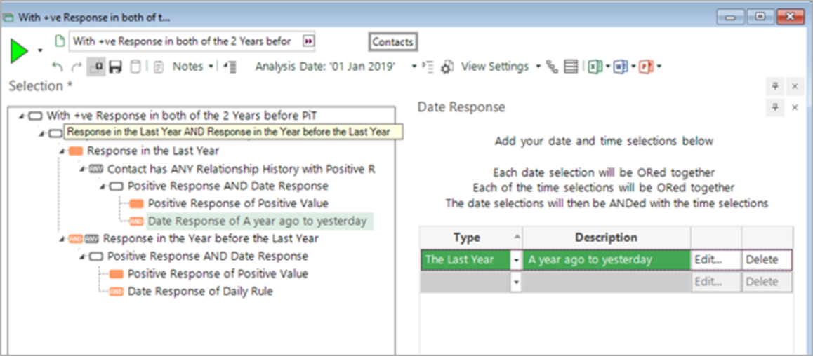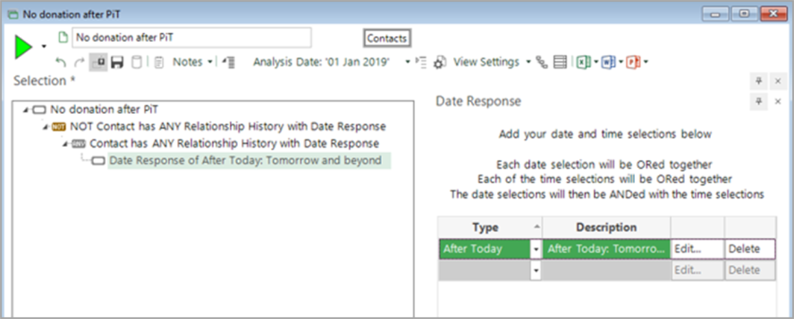 A simple way to identify people who have churned is to use an analysis selection of “people with no future donation”. Note that behavioural modelling selections must use the Today construct; this will be substituted throughout the model building process with the training, evaluation and scoring dates.