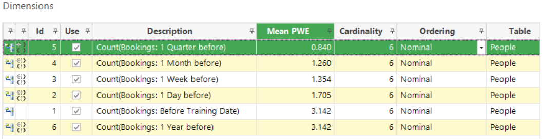 The purpose of the Dimensions tab is to identify a short-list of Behavioural Features which best distinguish the target Analysis selection. You should use the tab to explore Behavioural Features and identify the most predictive ones. Once those Behavioural Features are identified, you can then create and evaluate the models.