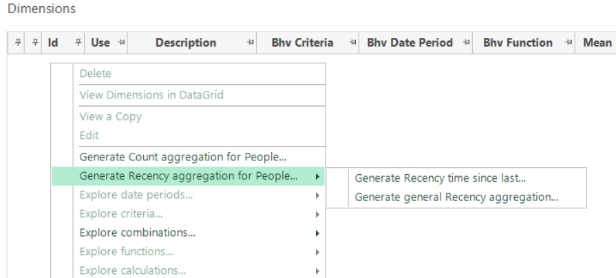Behavioural Features are generated and explored using right-click menu options within the Dimensions tab.