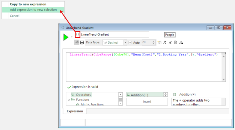 We've introduced the ability for you to drag one expression into another using its drag handle. This copies all of the expression text to the insertion position of the new expression, and will also include any embedded queries, aggregations and cube lookups. Validation occurs to ensure you aren’t adding too many queries/cubes for the expression.