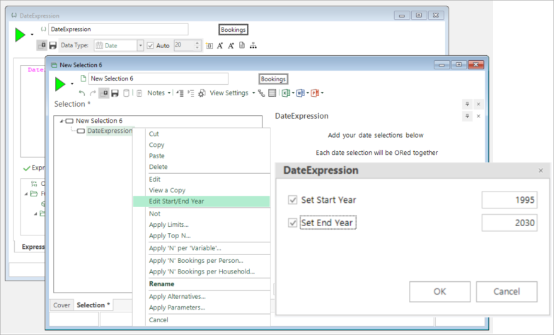 When creating a selection using a date expression for analysis prior to the year 2000, remember to right click and define the required start and end years - see below.